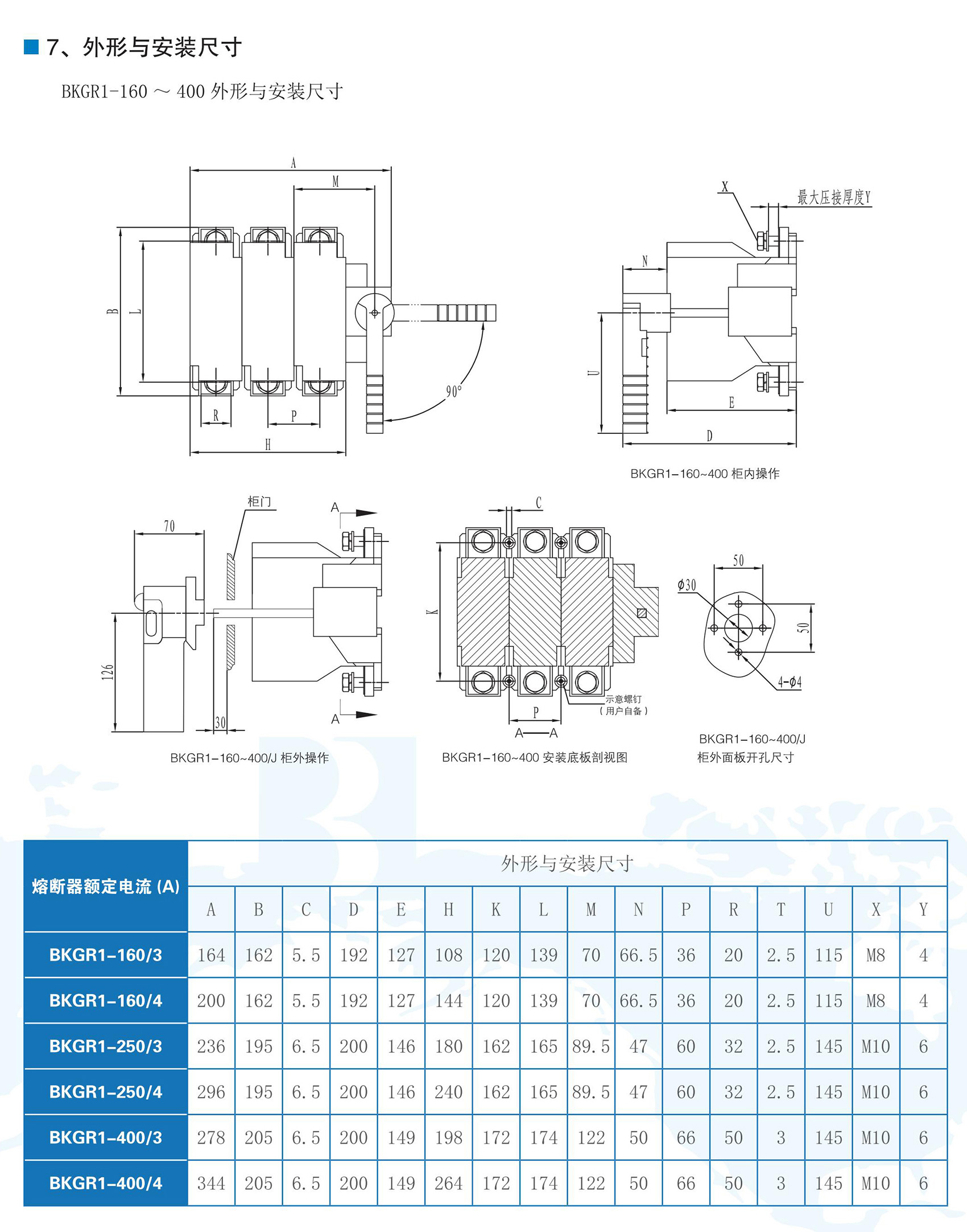 BKGR1系列隔离开关熔断器组适用于交流50Hz,额定工作电压为AC400V,额定工作电流63A-630A的低压配电或电动机网络中,作为不频繁接通、分断电路及线路的隔离之用。可提供短路、过载保护功能。BKGR1系列隔离开关熔断器组符合GB/T 14048.3《低压开关设备和控制设备低压开关、隔离器、隔离开关及熔断器组合电器》。
